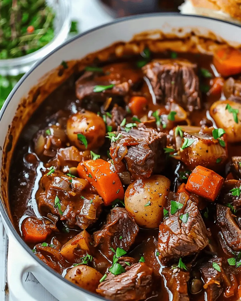 Once your ingredients are well combined, pour in the beef stock until everything is just submerged. Bring the mixture to a gentle simmer, then cover the pot and reduce the heat to low. The magic of slow cooking comes next! Allow this beautiful concoction to simmer for about 2 to 3 hours, or until the beef is fork-tender—your patience will be rewarded.