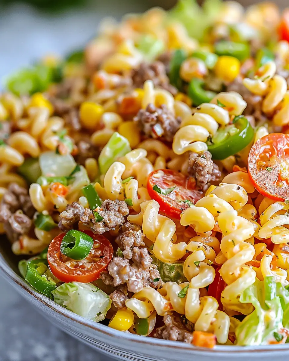 Versatility: You can customize your Big Mac Pasta Salad according to your dietary preferences. Vegetarian? Ditch the meat and add extra veggies or plant-based proteins. Gluten-free? Use a gluten-free pasta option!