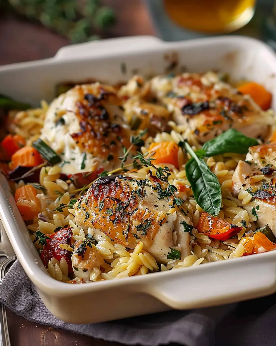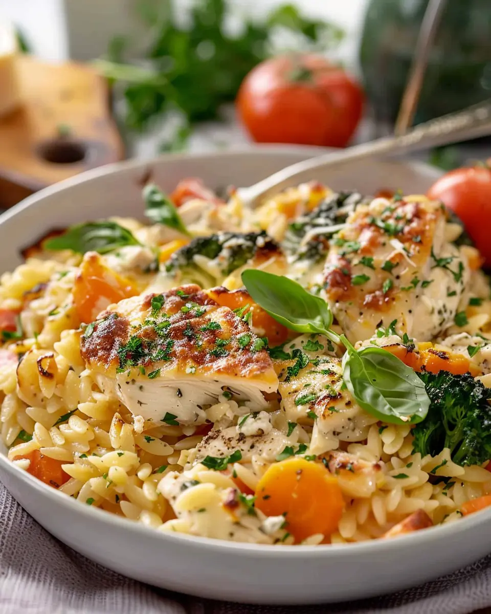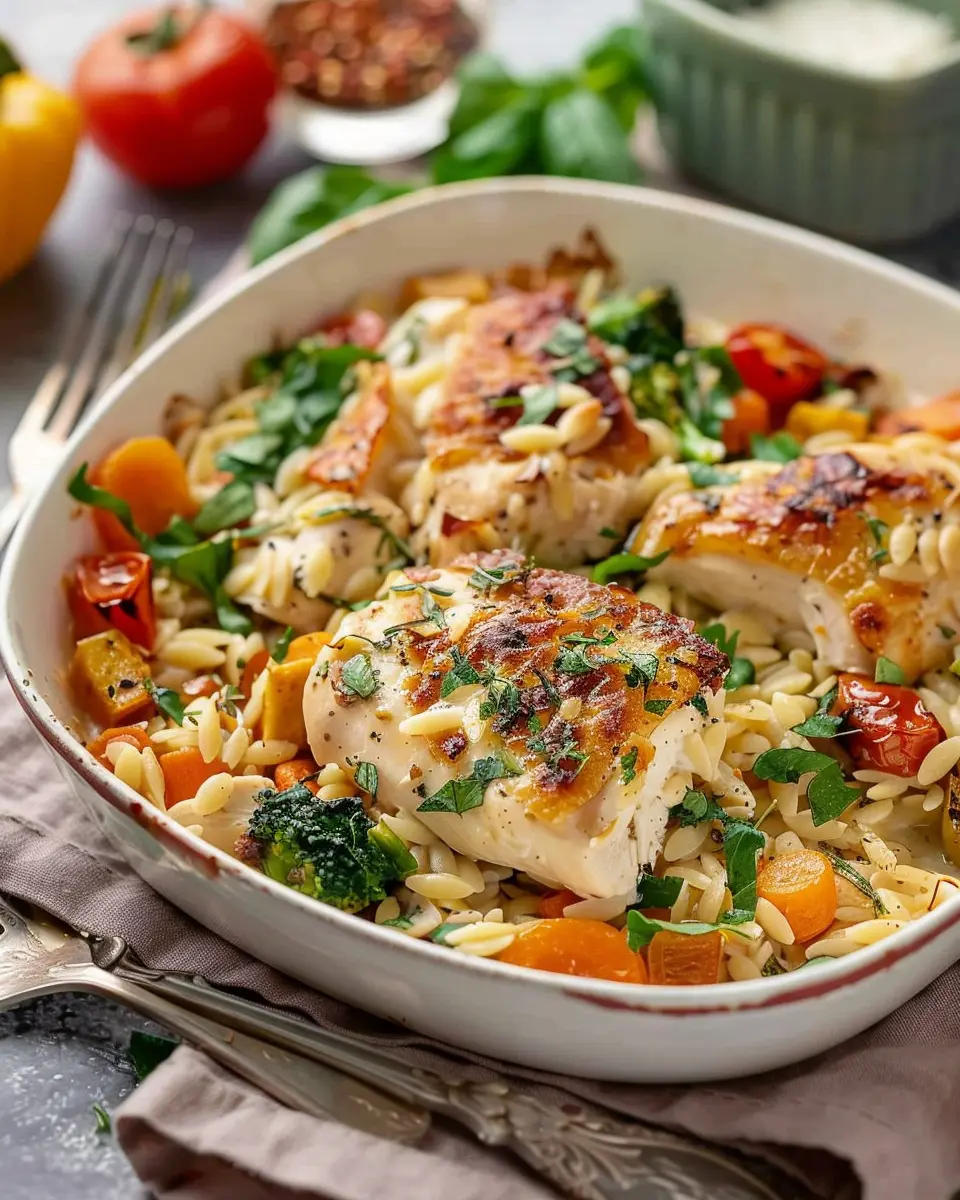 A creamy and flavorful Boursin Orzo Bake loaded with chicken and vegetables, perfect for a comforting meal.