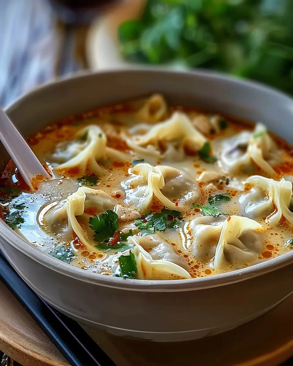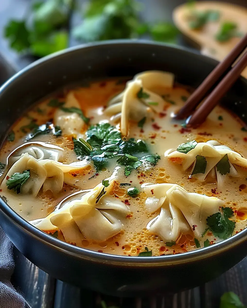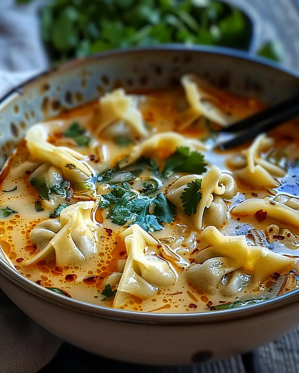 A warm and soothing soup that combines the flavors of Thai cuisine with potstickers, making it the perfect comfort food.