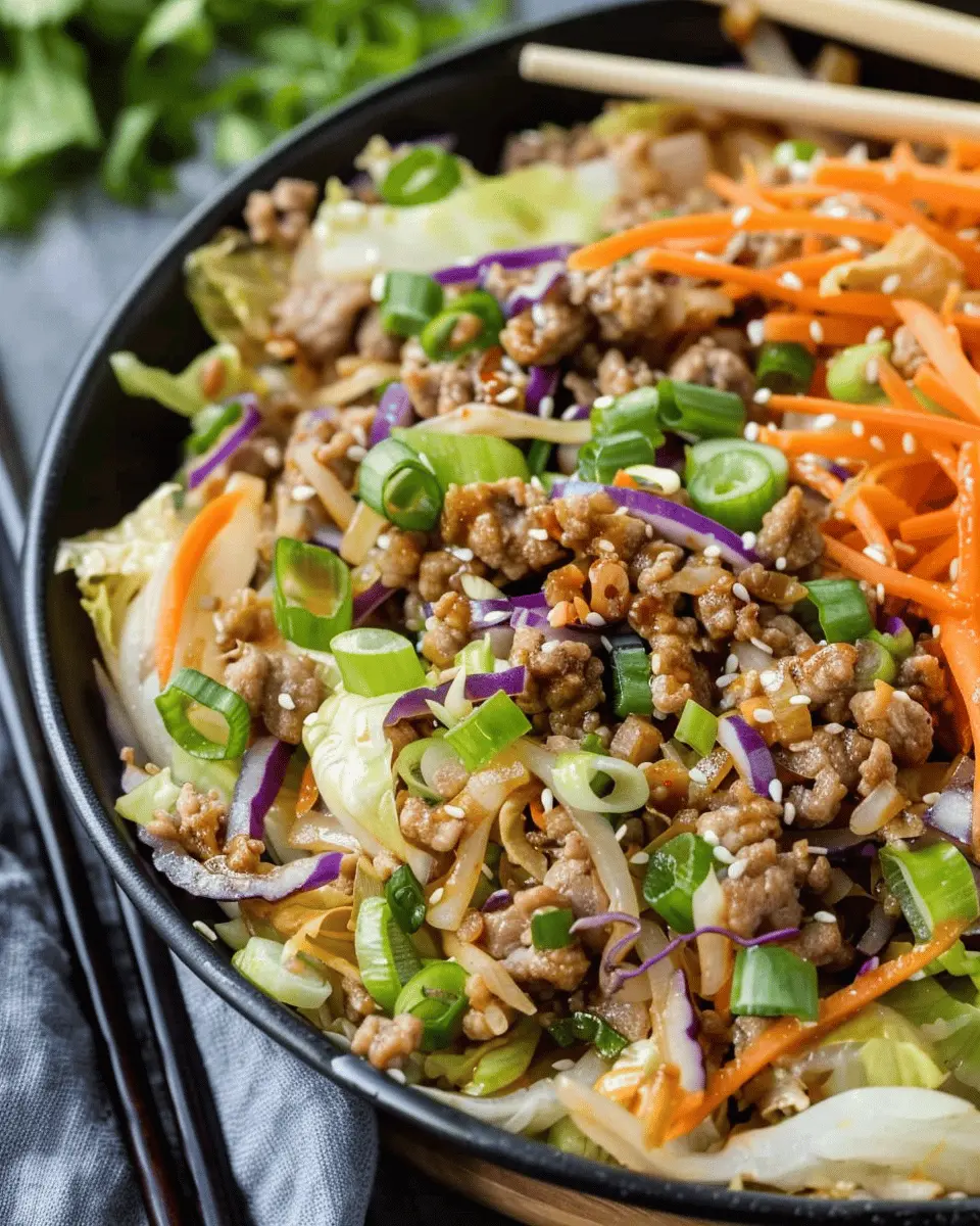 Getting started on your Egg Roll in a Bowl Recipe isn’t a time-consuming task. You can expect to spend about 10 minutes prepping your ingredients. This includes chopping vegetables like cabbage, carrots, and green onions, as well as getting your seasonings ready.