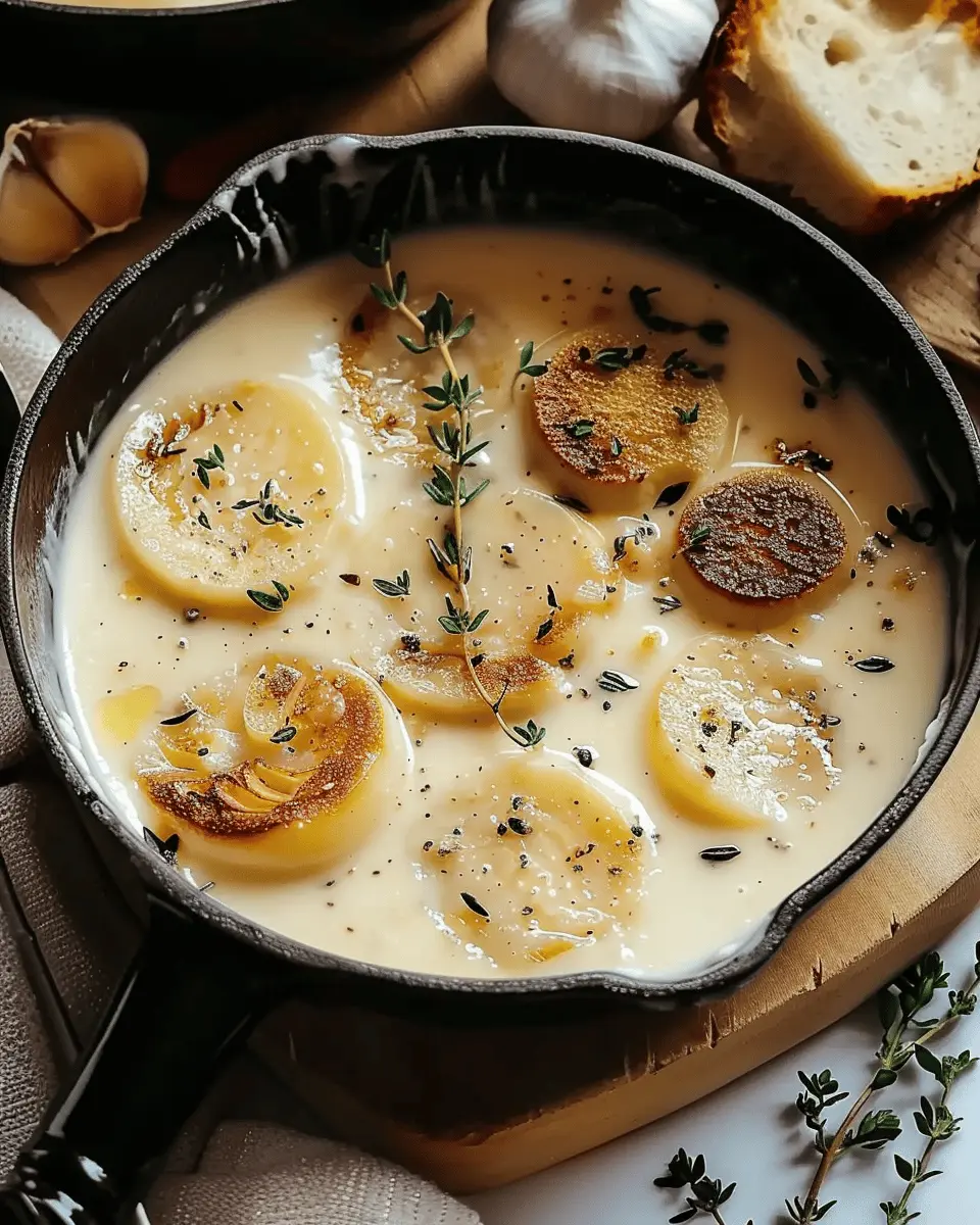 This French Garlic Soup is a comforting dish that combines the rich flavors of roasted garlic with the savory taste of turkey bacon.