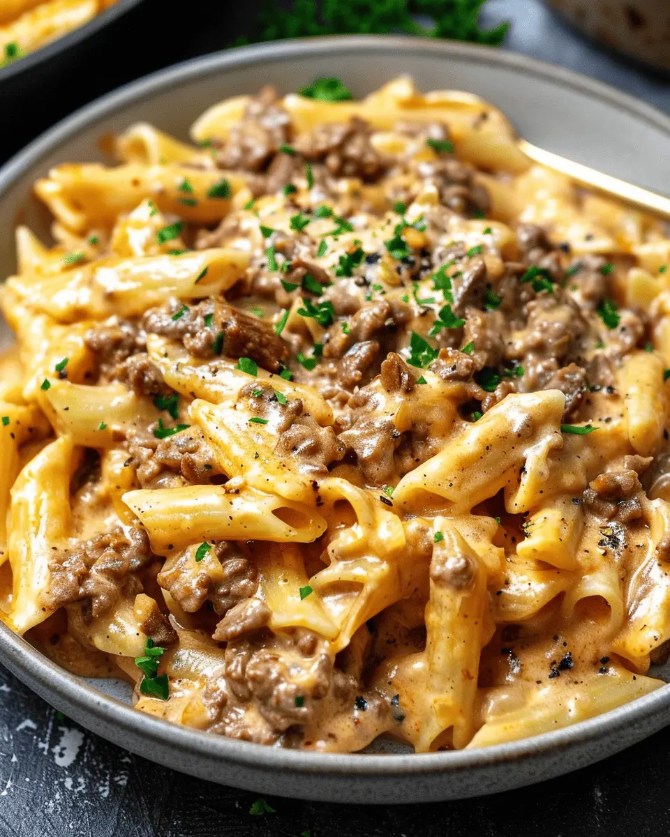 • Add pasta to the skillet: Toss the pasta in with the creamy beef mixture, ensuring each strand is well coated.