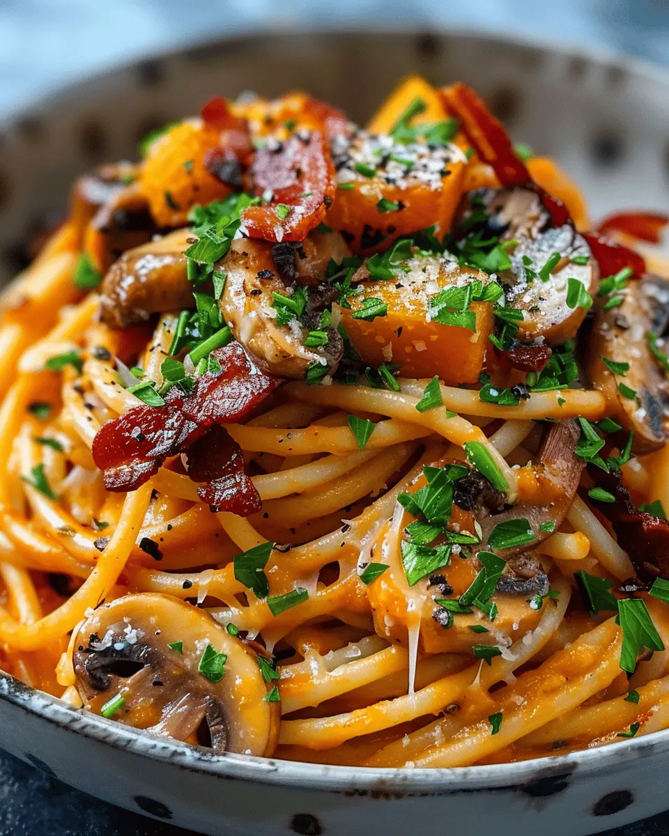 Enjoy the delightful combination of pumpkin and mushrooms with crispy turkey bacon in this rich and satisfying spaghetti dish.
