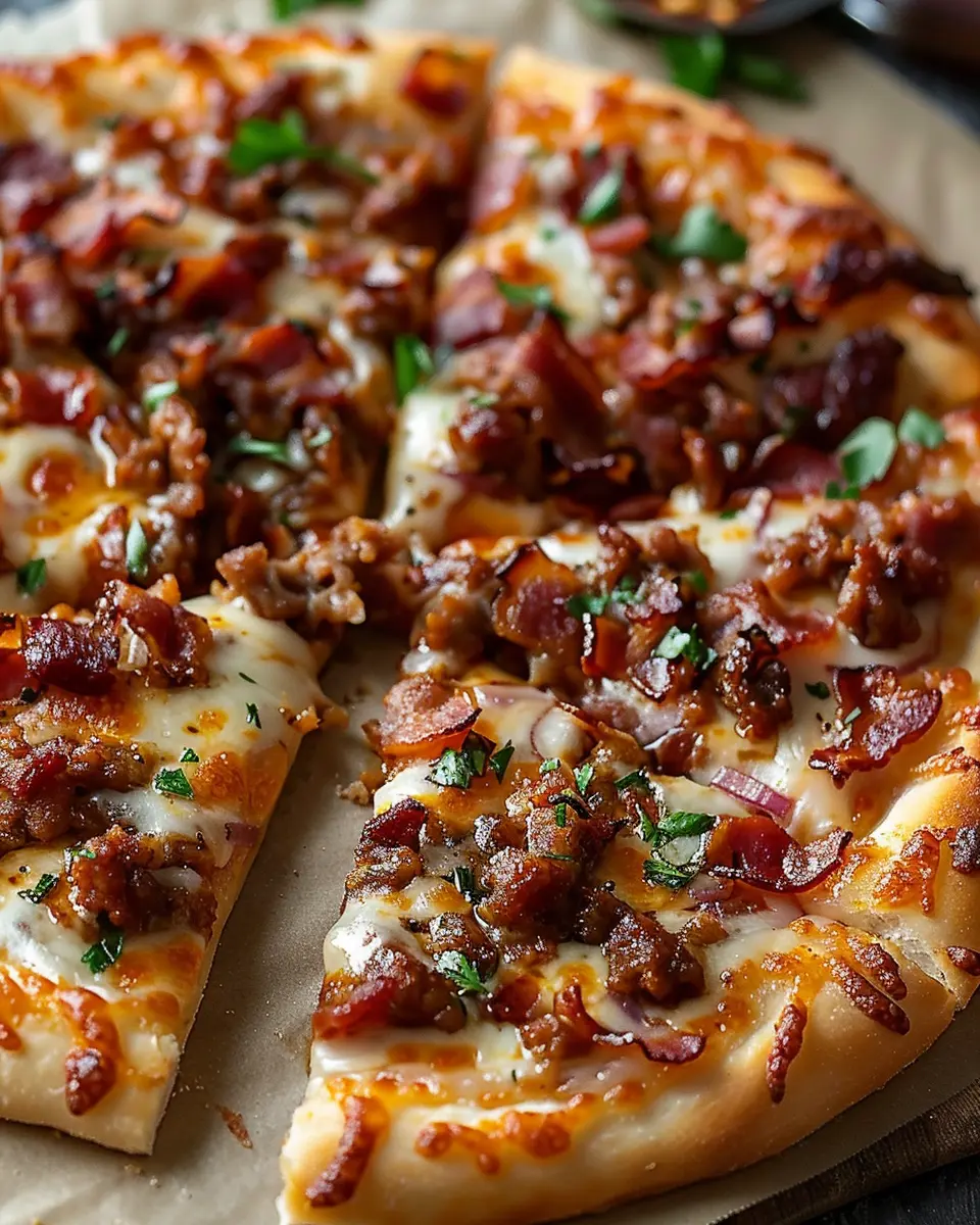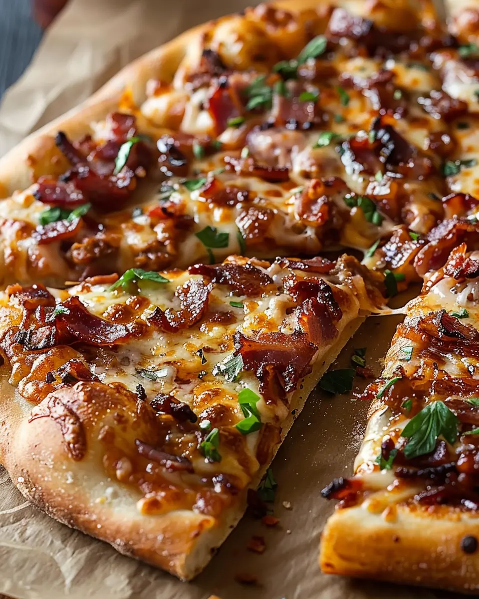 Enjoy a delightful twist on pizza with this Smoky Barbecue Beef Turkey Bacon Pizza. Perfect for any occasion!