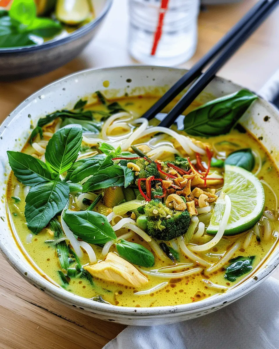 If you’re looking to enjoy a Thai Green Curry Noodle Soup without animal products, you’re in luck! There are fantastic vegan versions that don’t compromise on flavor. Start by replacing the conventional broth with a vegetable-based broth, which can enhance the soup’s comforting essence. For creaminess without dairy, coconut milk is your best friend—it’s essential for that signature curry richness.