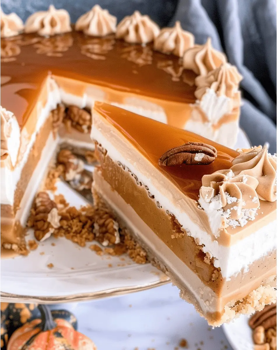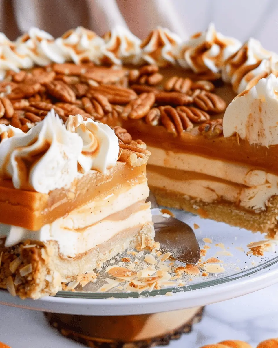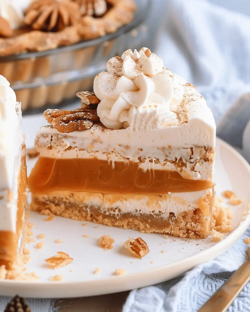 - Carefully place the pumpkin pie on top, followed by another layer of cake.